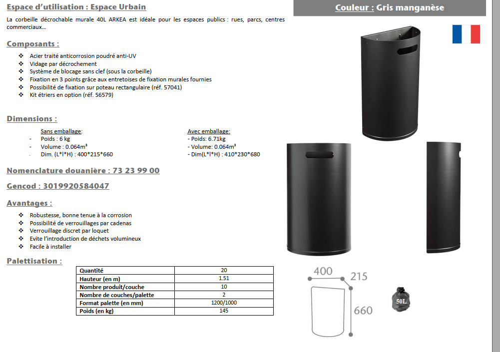 CORBEILLE MURALE DECROCHABLE « ARKEA » 40 L